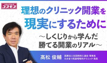 2025年8月29日(金)に開催された株式会社コスモス薬品主催のオンラインセミナーに、講師・髙松 俊輔医師(翔和仁誠会理事長)が登壇いたしました。本セミナーでは、クリニック開業をご検討中の医師の方を対象に、「開業の進め方と成功のポイント ~しくじりから学んだ勝てる開業のリアル~」をテーマに、…